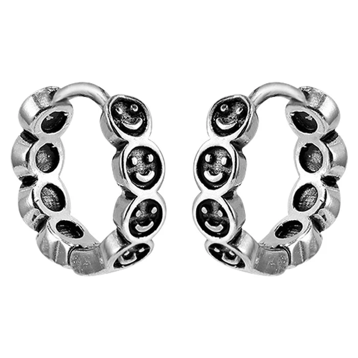 Náušnice z chirurgické oceli kroužky tvořené spojenými ikonami smajlíků. Kroužky mají vnitřní průměr 10mm, vnější průměr 14mm. Náušnicové zapínání je kloubové.