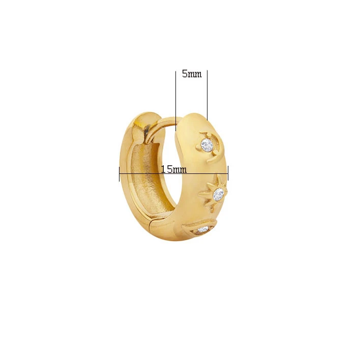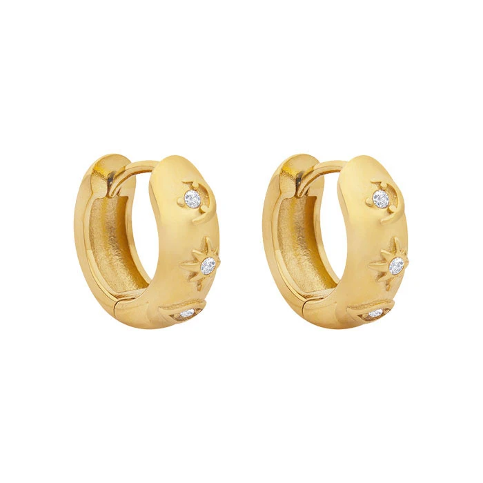 Náušnice z chirurgické oceli kroužky. Náušnice jsou ozdobené symboly měsíce a hvězd. Vnější průměr náušnic 15mm, šířka náušnic 5mm. Náušnicové zapínání je kloubové.