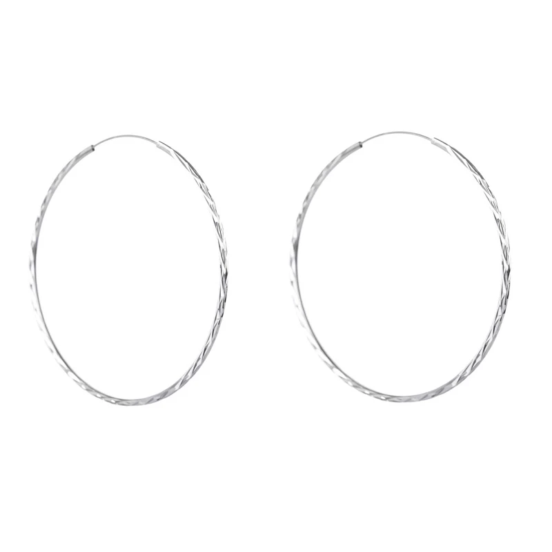 Kruhové stříbrné náušnice se vzorem. Náušnice velké kruhy vyrobené ze stříbra 925/1000. Povrch náušnic je porhodiovaný. Úprava náušnic rhodiováním jim dodává jasnou barvu s leskem, zvyšuje odolnost povrchu proti poškrábání a zaručuje jejich dlouhodobý bezchybný vzhled. Náušnice jsou široké 2mm, vnější průměr 70mm.