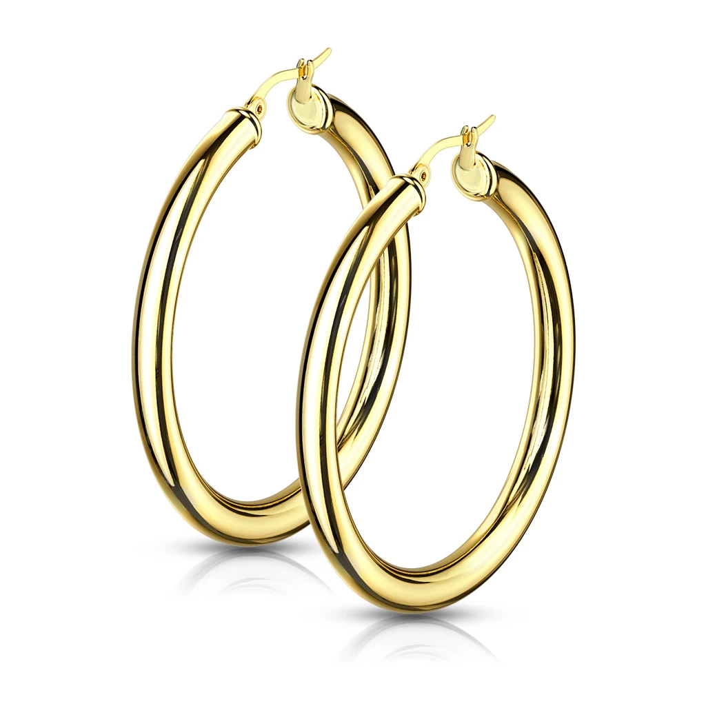 Náušnice z chirurgické oceli kruhy. Náušnice mají leštěný povrch. Vnější průměr náušnic 50mm, vnitřní průměr náušnic 50 mm, průměr "těla" náušnic 5 mm. Náušnice se zapínají na francouzský zámek.