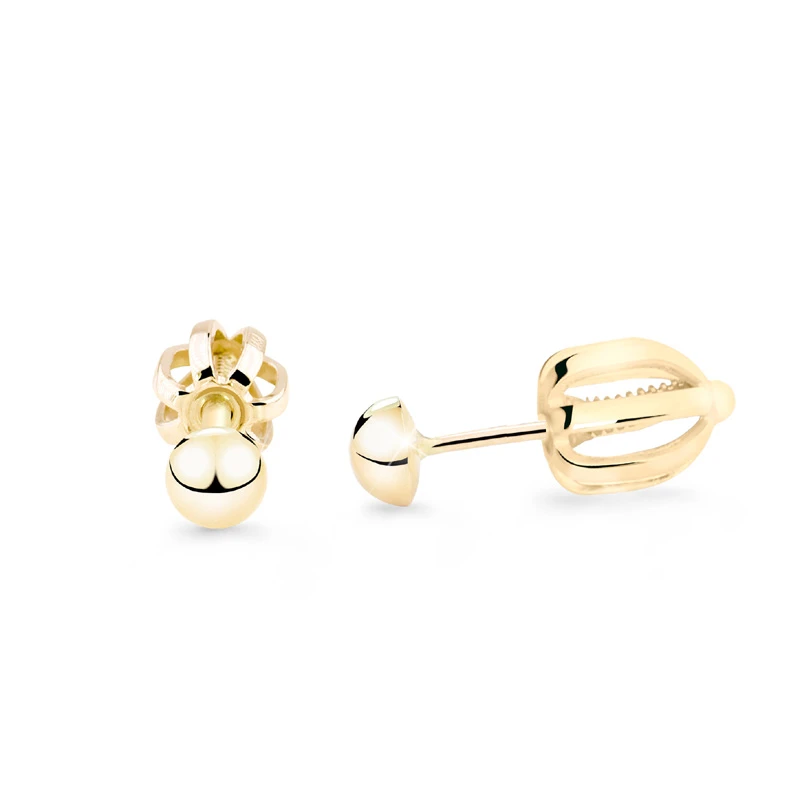 Náušnice pecky na šroubek ze žlutého zlata ryzosti 585/1000. Zlaté náušnice se zapínáním na šroubek. Průměr polokouličky 4mm. Průměr dříku 0,9mm.
