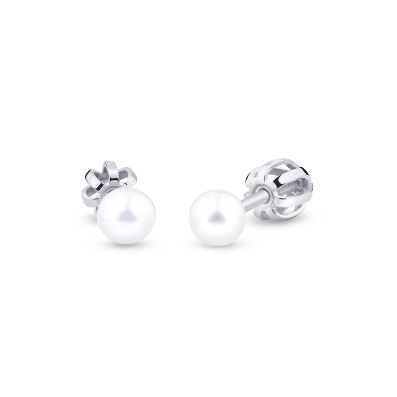 Zlaté náušnice na šroubek s kultivovanou říční perlou z bílého zlata ryzosti 585/1000. Osazené perly jsou v kvalitě AAA. Průměr perliček 4mm. Náušnicové zapínání je na šroubek.