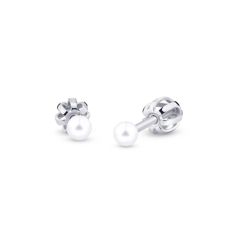 Zlaté náušnice na šroubek s kultivovanou říční perlou z bílého zlata ryzosti 585/1000. Osazené perly jsou v kvalitě AAA. Průměr perliček 3mm. Náušnicové zapínání je na šroubek