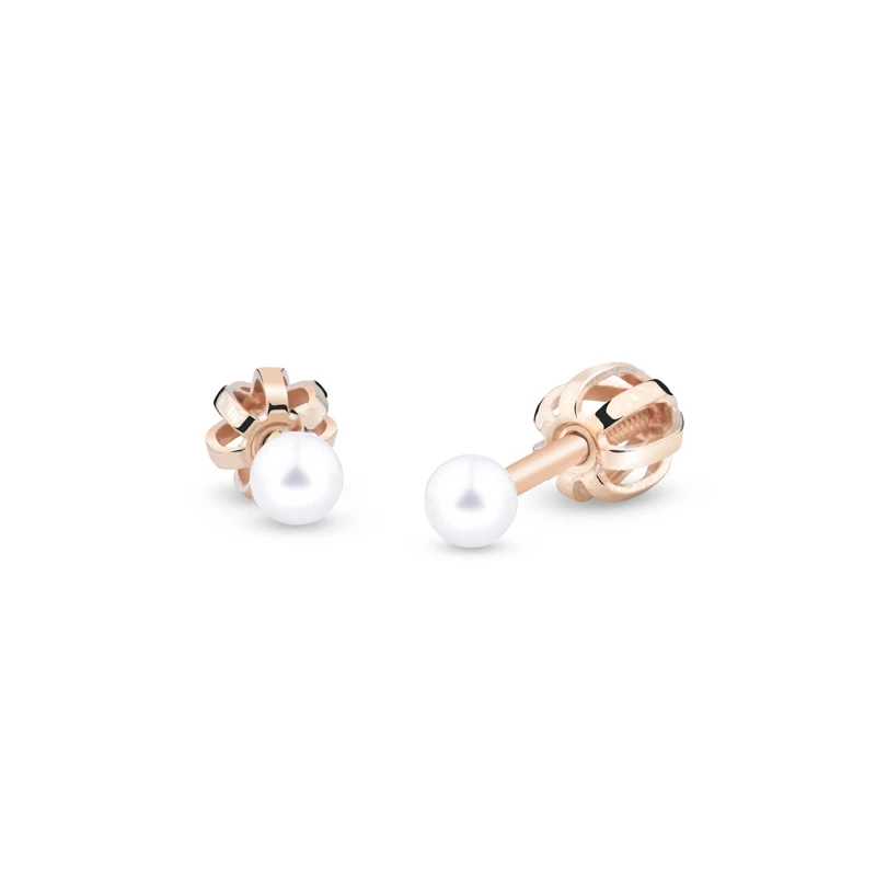 Zlaté náušnice na šroubek s kultivovanou říční perlou z růžového zlata ryzosti 585/1000. Osazené perly jsou v kvalitě AAA. Průměr perliček 3mm. Náušnicové zapínání je na šroubek.