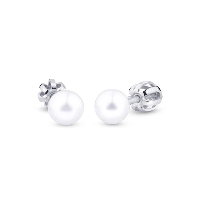 Zlaté náušnice na šroubek s kultivovanou říční perlou z bílého zlata ryzosti 585/1000. Osazené perly jsou v kvalitě AAA. Průměr perliček 5mm. Náušnicové zapínání je na šroubek
