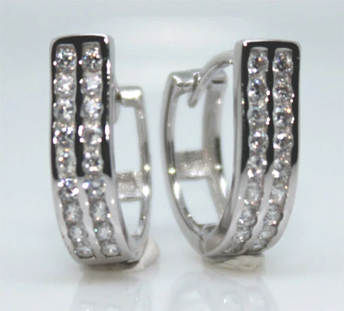 Dámské náušnice se zirkony vyrobené ze stříbra 925/000. Náušnice mají porhodiovaný povrch. Nanesené rhodium dodává naušnicím jasnou barvu a lesk. Rozměr náušnic 14x4x14mm. Náušnicové zapínání má průměr 11mm.