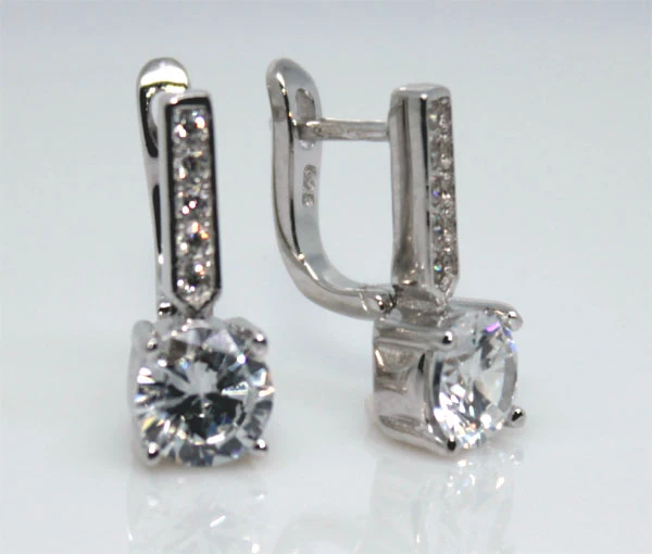 Stříbrné náušnice se zirkony. Povrch náušnic je porhodiovaný. Povrch upravený rhodiem má jasnou barvu a lesk. Rhodium současně zamezuje přirozené oxidaci stříbra. Ozdoba se zirkonem má průměr 6mm, rozměr náušnic 15x6mm, rozměr náušnicového zapínání 6x5mm.