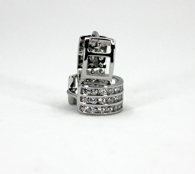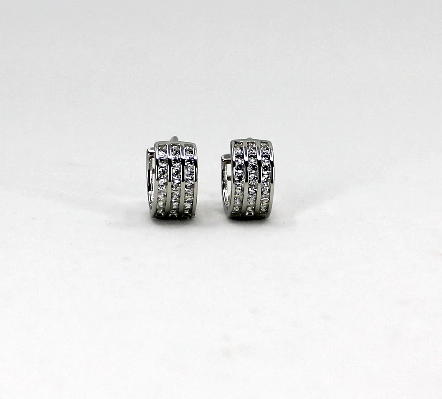 Stříbrné náušnice kroužky se zirkony. Náušnice jsou vyrobené ze stříbra 925/1000 a osazené prvotřídními zirkony. Povrch náušnic je porhodiovaný, což jim dodává jasnou barvu s leskem, potlačuje přirozenou oxidaci stříbra, zvyšuje odolnost povrchu proti poškrábání a zaručuje dlouhodobý bezvadný vzhled náušnic. Náušnice jsou široké 6mm, vnější průměr náušnic 12mm. Náušnicové zapínání je kloubové.