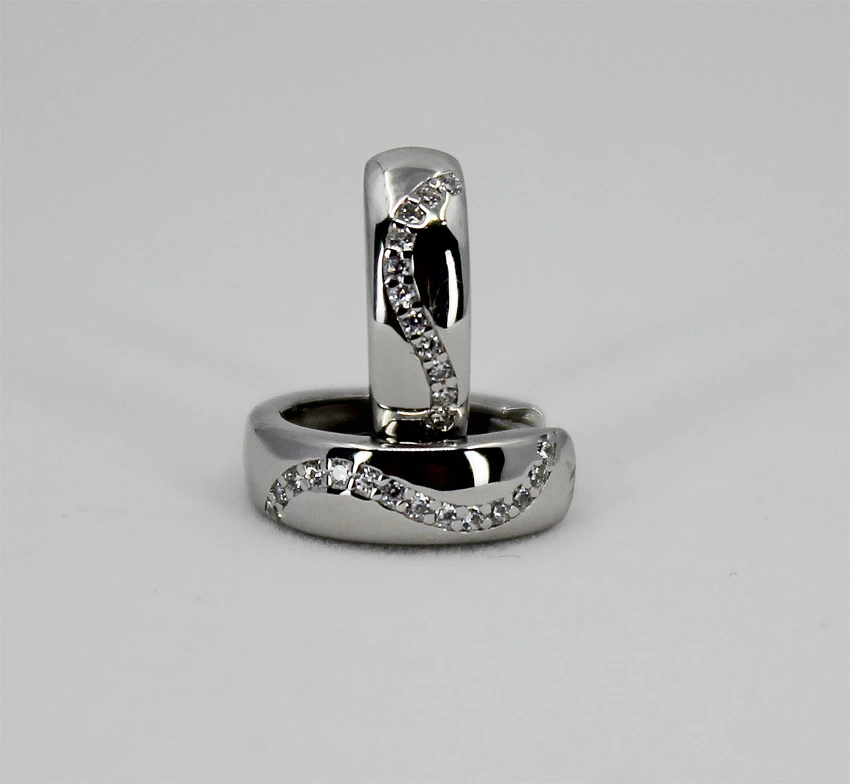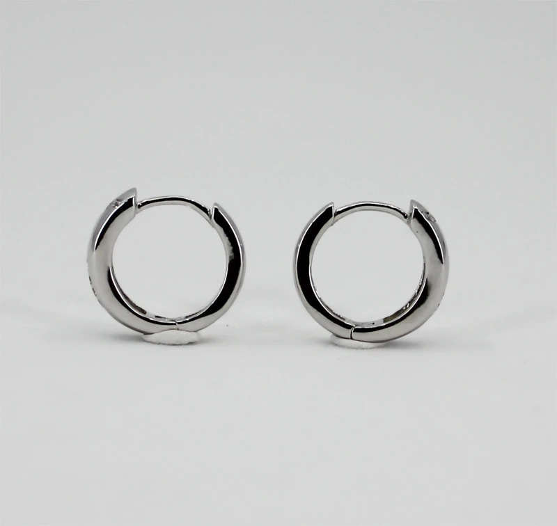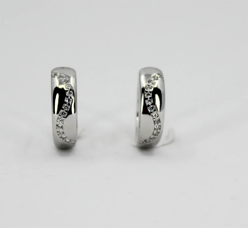 Stříbrné náušnice kroužky se zirkony. Náušnice jsou vyrobené ze stříbra 925/1000 a osazené prvotřídními zirkony. Povrch náušnic je porhodiovaný, což jim dodává jasnou barvu s leskem, potlačuje přirozenou oxidaci stříbra, zvyšuje odolnost povrchu proti poškrábání a zaručuje dlouhodobý bezvadný vzhled náušnic. Náušnice jsou široké 4mm, vnější průměr náušnic 15mm. Náušnicové zapínání je kloubové.