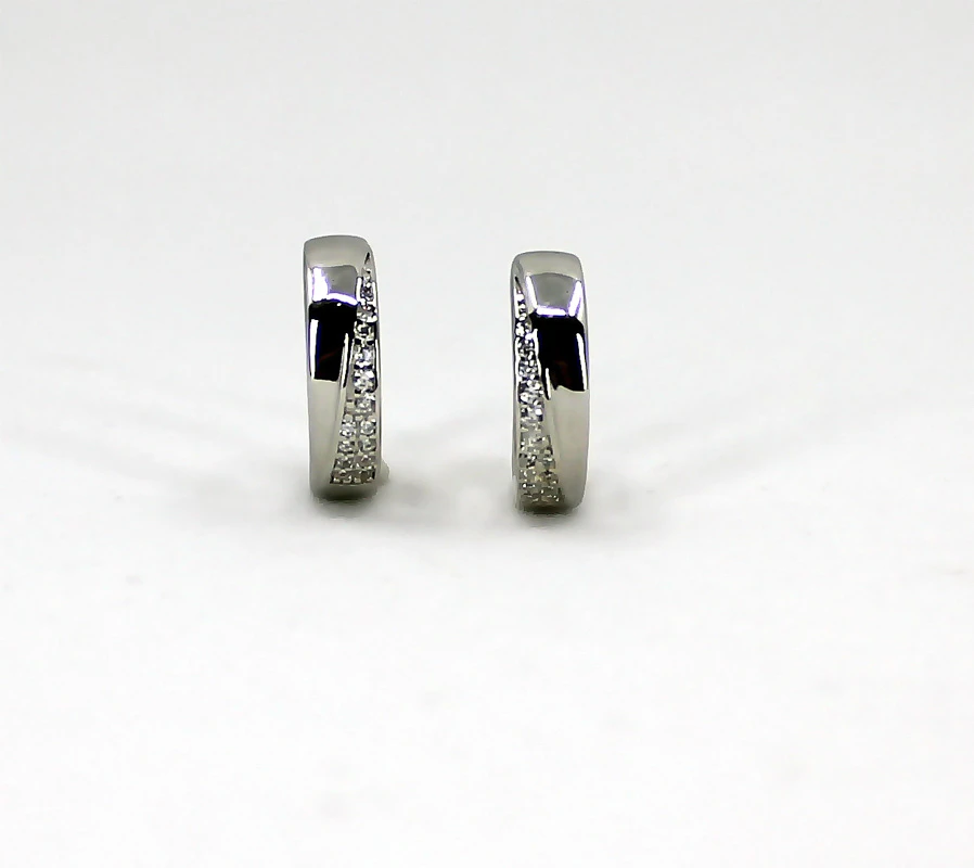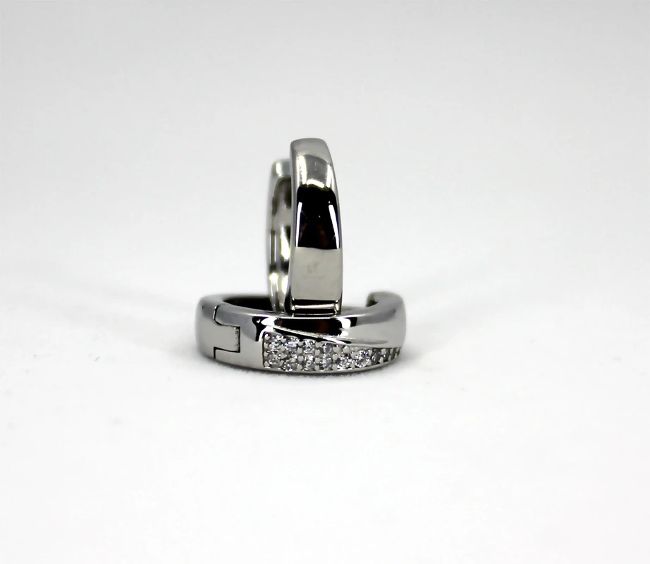 Stříbrné náušnice kroužky se zirkony. Náušnice jsou vyrobené ze stříbra 925/1000 a osazené prvotřídními zirkony. Povrch náušnic je porhodiovaný, což jim dodává jasnou barvu s leskem, potlačuje přirozenou oxidaci stříbra, zvyšuje odolnost povrchu proti poškrábání a zaručuje dlouhodobý bezvadný vzhled náušnic. Náušnice jsou široké 4mm, vnější průměr náušnic 15mm. Náušnicové zapínání je kloubové.