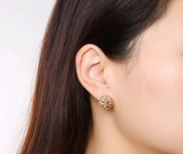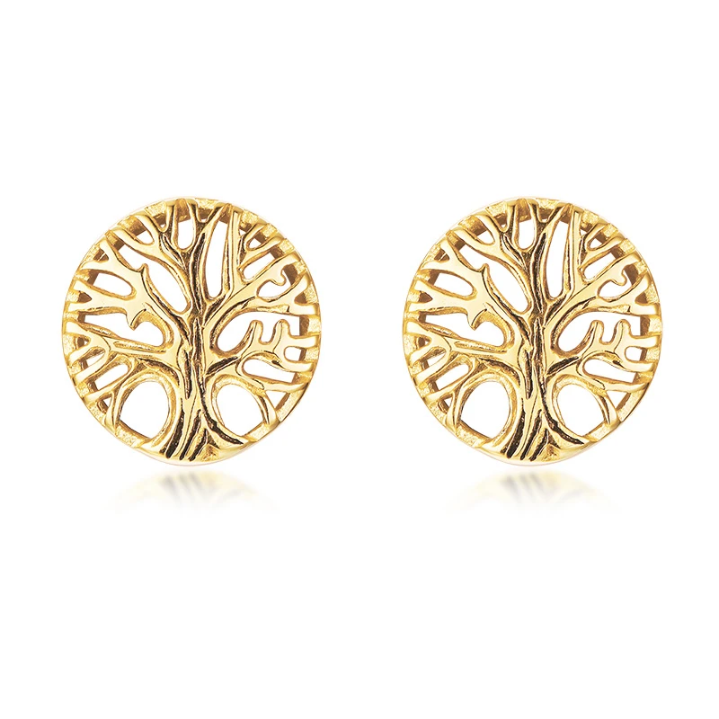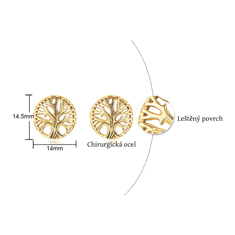 Náušnice pecky z chirurgické oceli s motivem stromu života. Povrch náušnic je upravený zlatou IP barvou. Náušnice se zapínají na puzetky. Rozměr náušnic 14,5x14 mm.