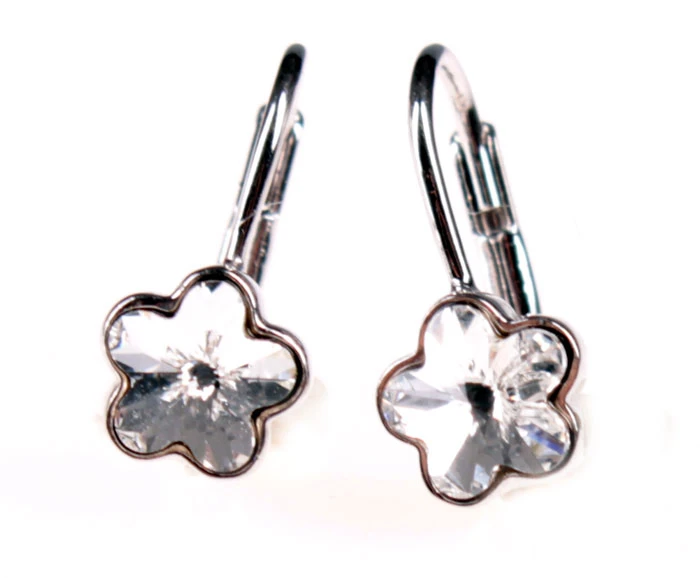 Visací náušnice ozdobené kamínky Swarovski ve tvaru kytiček. Kamínky mají průměr 6mm, rozměr náušnic 13×8mm. Zapínání na stříbrný patent.