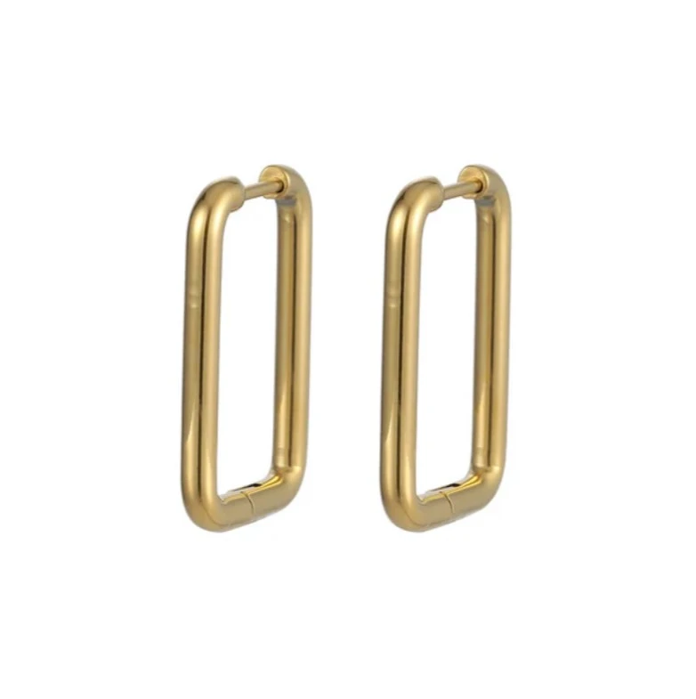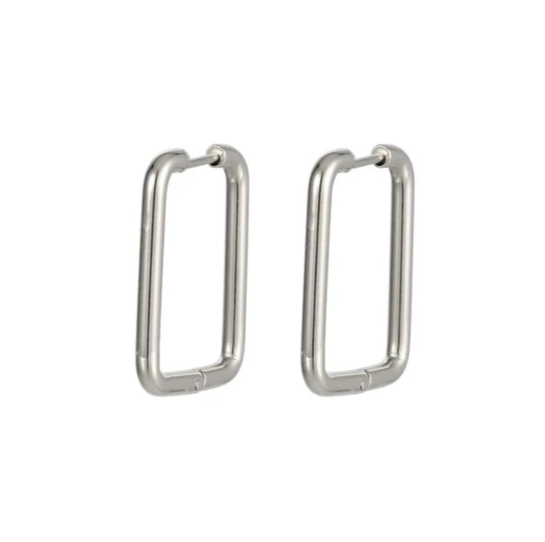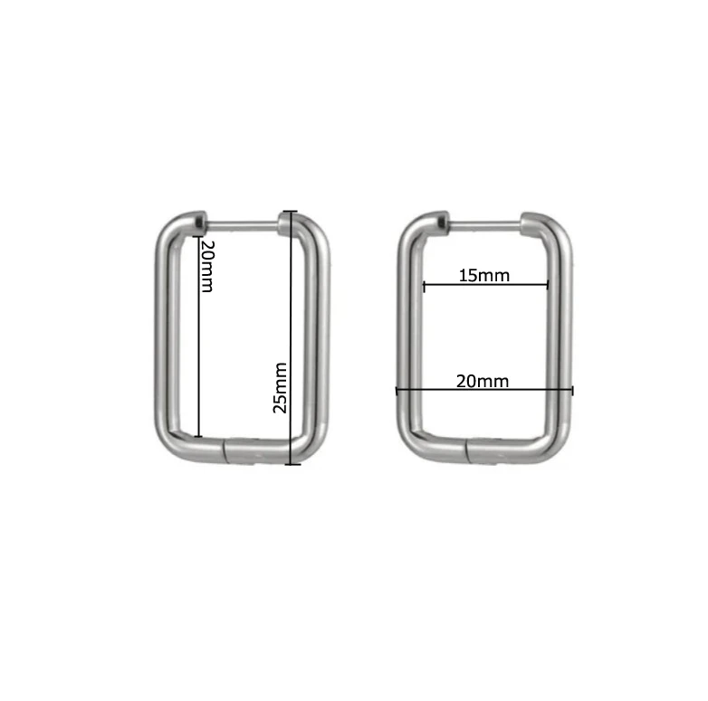 Visací náušnice z chirurgické oceli ve tvaru obdélníku. Povrch náušnic je leštěný. Náušnice jsou široké 20mm, dlouhé 25mm. Všechny rozměry náušnic najdete na podpůrné fotografii. Zapínání náušnic je kloubové. Cena je uvedena za pár.