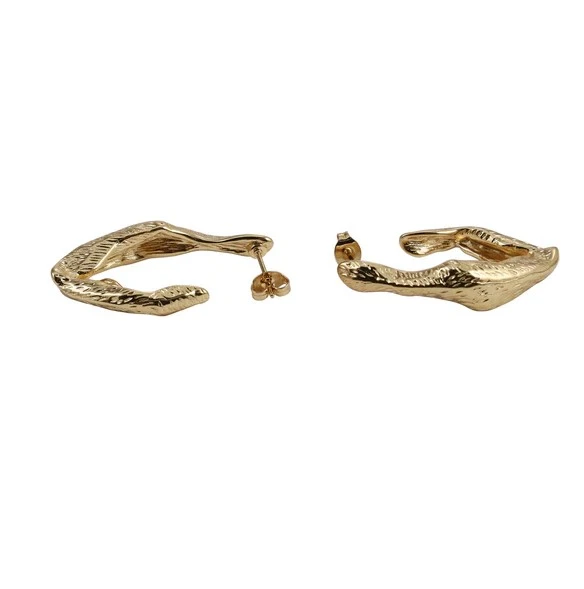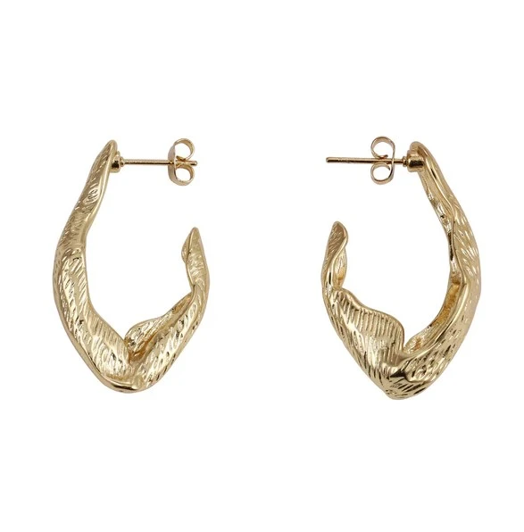 Visací náušnice vyrobené z chirurgické oceli. Povrch náušnic je pozlacený technologií PVD se vzorem na vnější i vnitřní straně. Netradiční visací náušnice dlouhé 40mm. Náušnicové zapínání je na puzety.