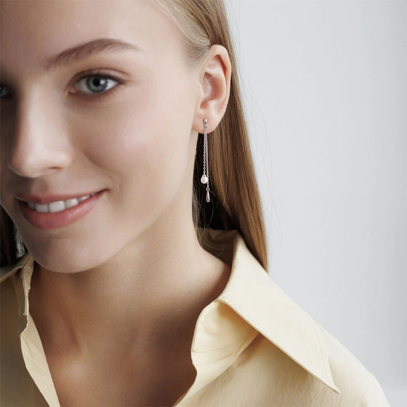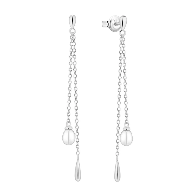 Visací náušnice vyrobené ze stříbra ryzosti 925/1000 osazené říčními perlami. Povrch náušnic je porodiovaný. Nanesené rodium dodává náušnicím jasnou barvu s leskem, a současně zajišťuje dlouhodobý bezchybný vzhled náušnic. Náušnicové zapínání je na puzetky. Náušnice jsou dlouhé 50 mm, říční perličky mají průměr 5 mm.