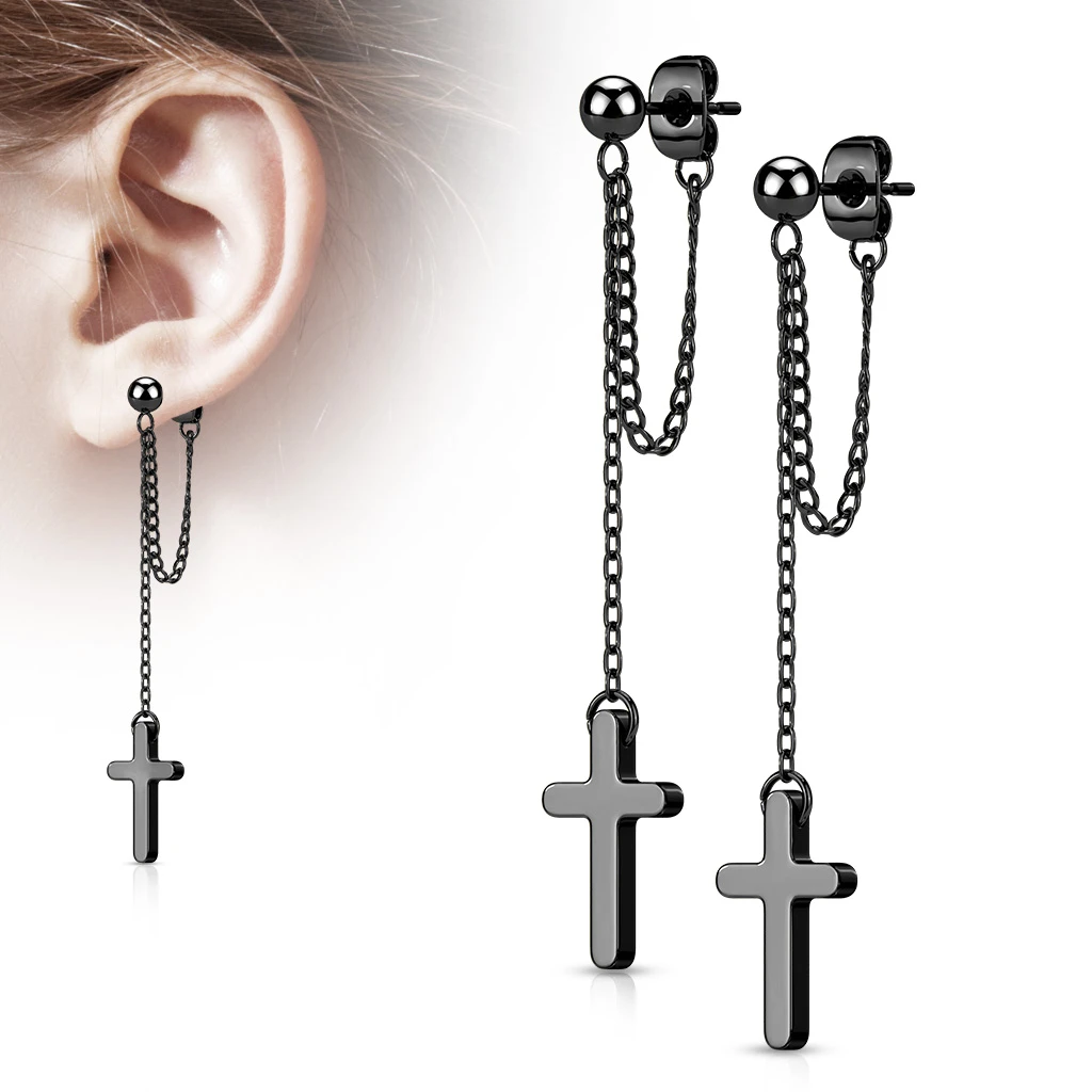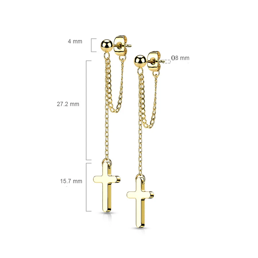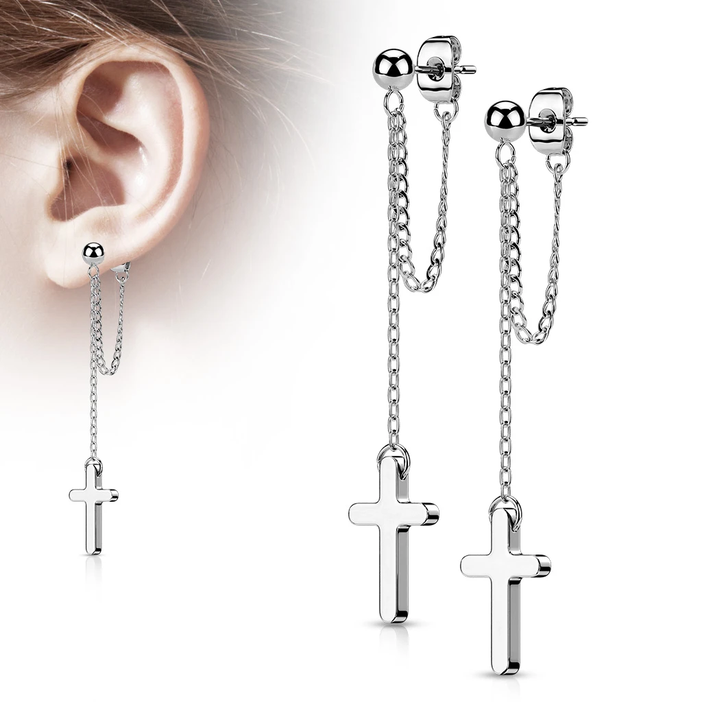 Visací náušnice z chirurgické oceli s řetízkem a křížkem. Náušnicové zapínání je na puzetky. Rozměry náušnic najdete přehledné zobrazené na podpůrné fotografii.