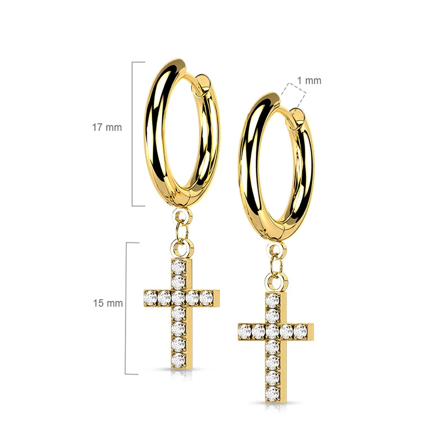 Náušnice z chirurgické oceli s křížky. Na kroužku je zavěšený křížek se zirkony. Vnější průměr kroužku 17mm, celková délka náušnice 32mm. Povrch náušnic je leštěný. Uvedená cena platí za pár náušnic.