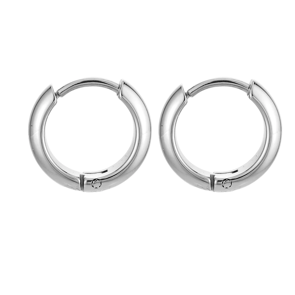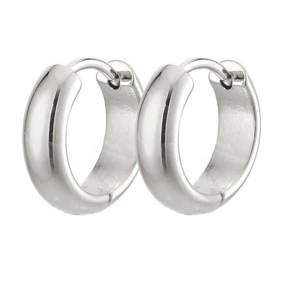 Minimalistické náušnice kroužky z chirurgické oceli. Povrch náušnic je leštěný. Náušnicové zapínání je kloubové. Vnější průměr náušnic 13mm, šířka náušnic 4mm.