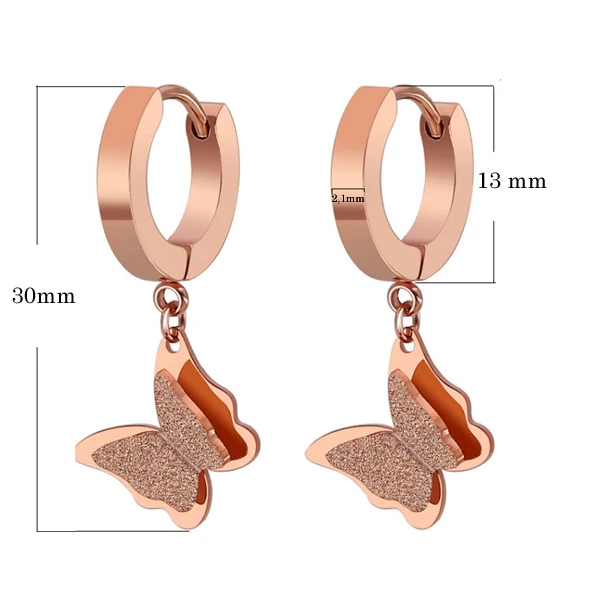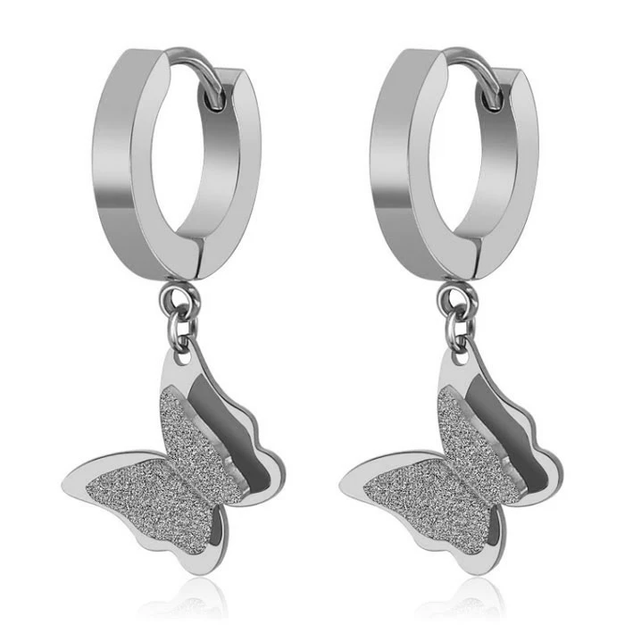 Ocelové náušnice kroužky. Povrch náušnic je leštěný. Kroužek je široký 2,1mm, vnější průměr kroužku 13mm. Celková délka náušnice s ozdobou motýlka 30mm. Uvedená cena platí za pár náušnic.