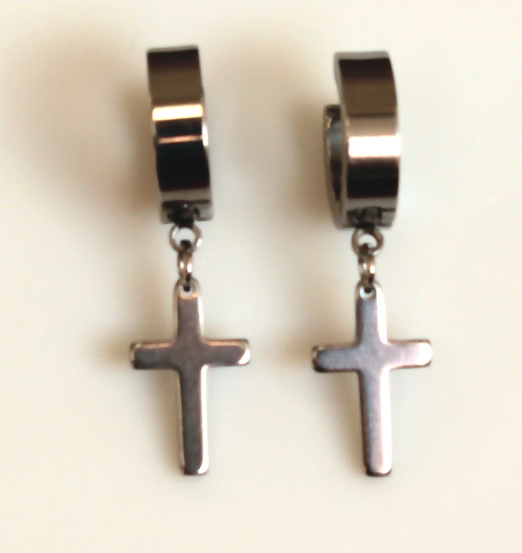 Ocelové náušnice kroužky. Povrch náušnic je leštěný. Kroužek je široký 4mm, vnější průměr kroužku 13mm. Celková délka náušnice s ozdobou křížku 30mm. Uvedená cena platí za pár náušnic.