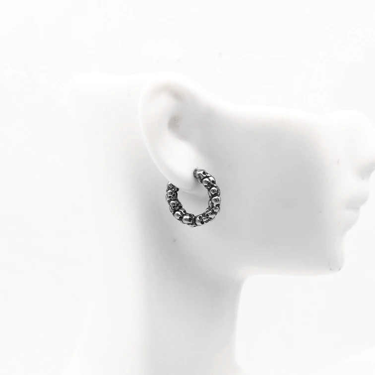 Náušnice kroužky vyrobené z chirurgické oceli. Náušnice představují navzájem propojené lebky do tvaru kroužku. Šířka náušnic 4mm, vnější průměr náušnic 17mm. Uvedená cena platí za pár náušnic.
