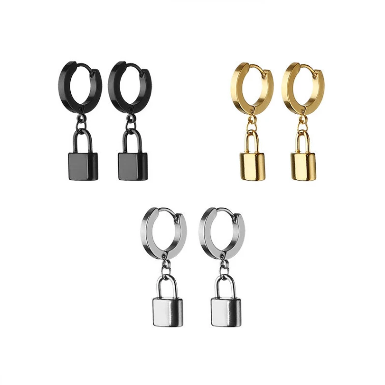 Náušnice kroužky z chirurgické oceli s přívěskem zámečku.