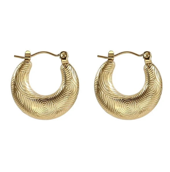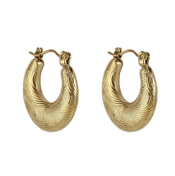 Kruhové náušnice z chirurgické oceli. Povrch náušnic je pozlacený technologií PVD a ozdobený gravírovaným vzorem. Náušnice mají vnější průměr 20mm. Náušnicové zapínání je na francouzský zámek.
