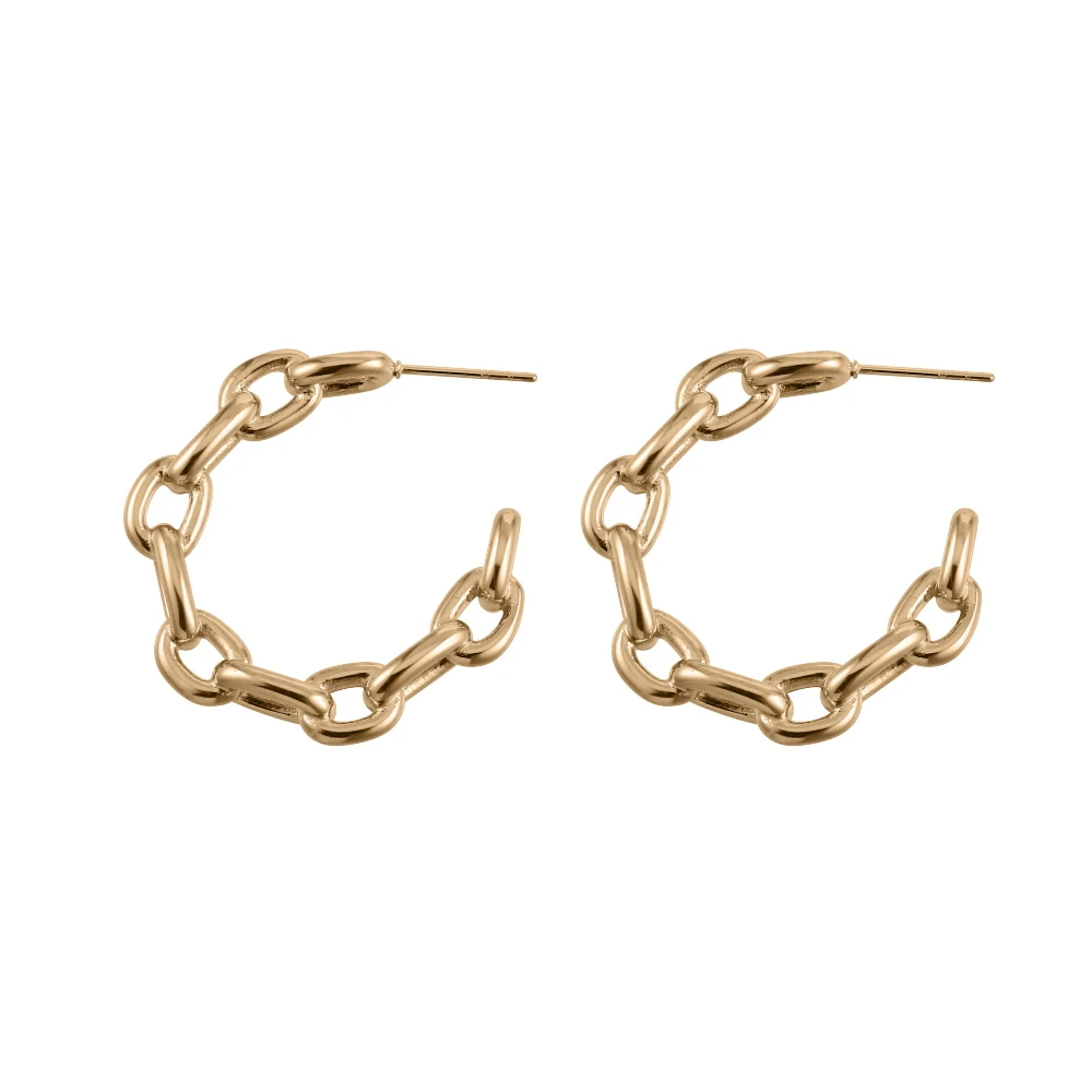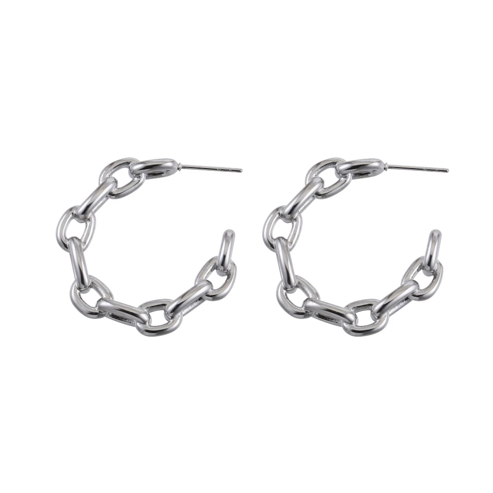 Řetízkové kruhové náušnice z chirurgické oceli. Povrch náušnice je leštěný. Vnější průměr náušnic 31mm. Náušnicové zapínání je na puzetky. Uvedená cena platí za pár náušnic.