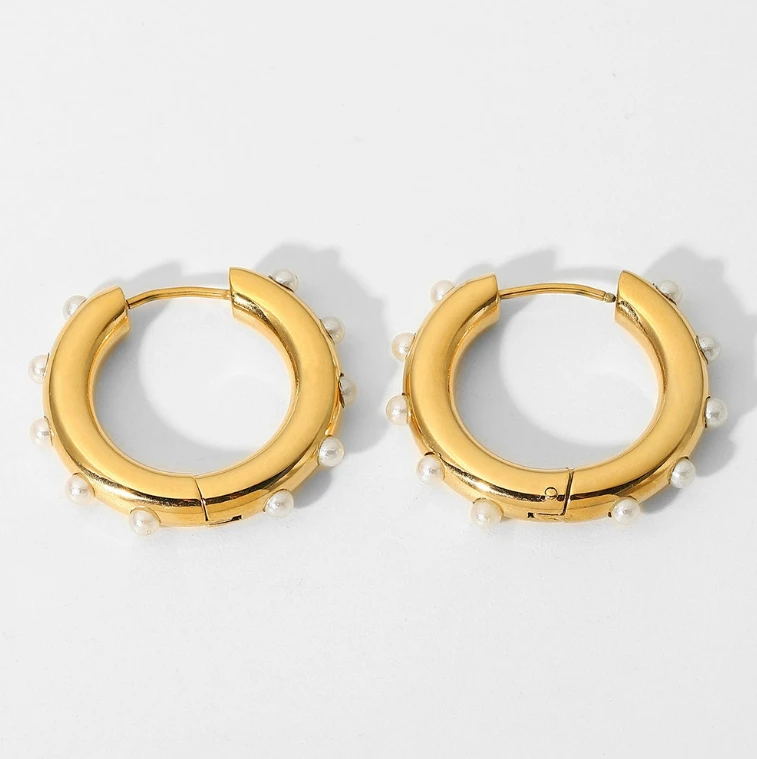 Kruhové náušnice z chirurgické oceli zdobené umělými perličkami. Povrch náušnic je pozlacený technologií IP. Náušnicové zapínání je kloubové. Vnější průměr náušnic 30mm, šířka náušnic 5mm.