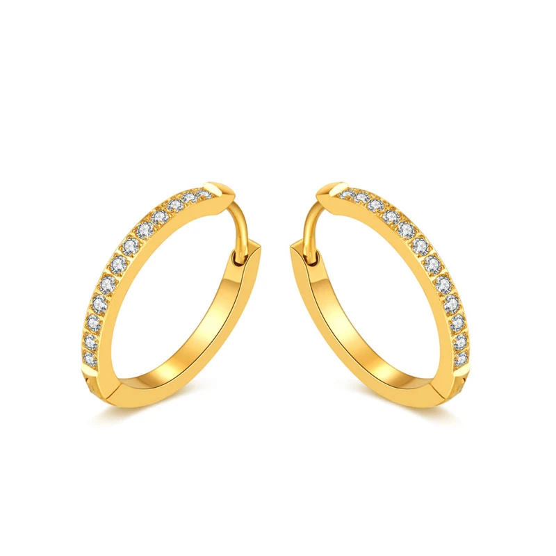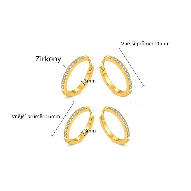 Ocelové kruhové náušnice ozdobené zářivými zirkony. Povrch náušnice je leštěný upravený technologií IP na zlatou. Náušnice jsou široké 3mm, vnější průměr náušnic 16mm. Náušnicové zapínání je kloubové.