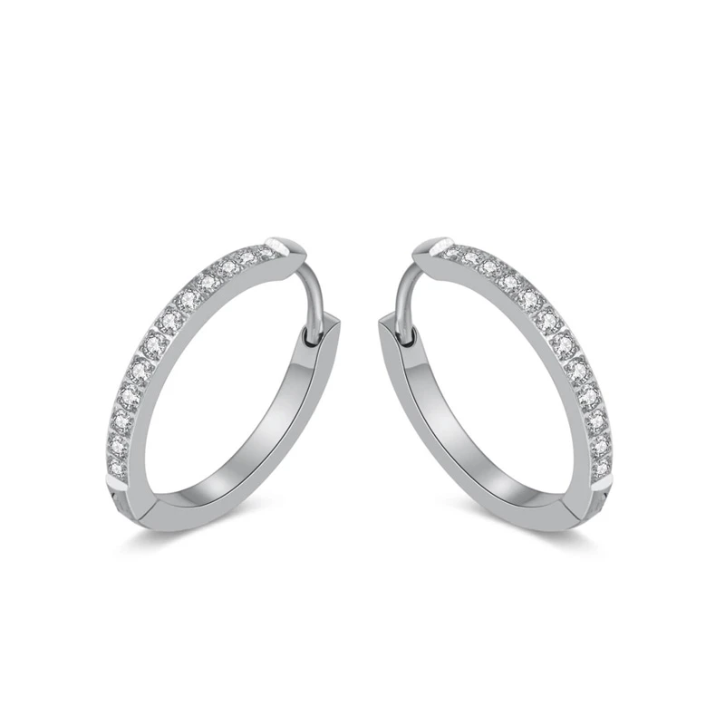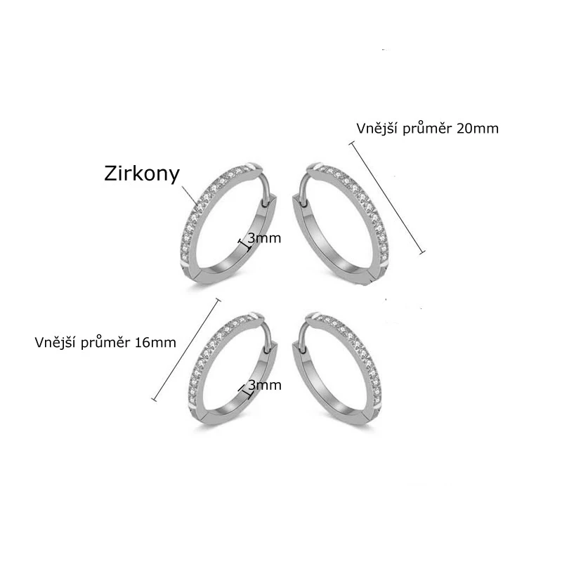 Ocelové kruhové náušnice ozdobené zářivými zirkony. Povrch náušnice je leštěný. Náušnice jsou široké 3mm, vnější průměr náušnic 20mm. Náušnicové zapínání je kloubové.
