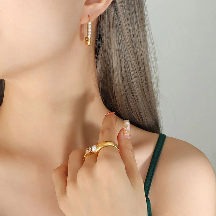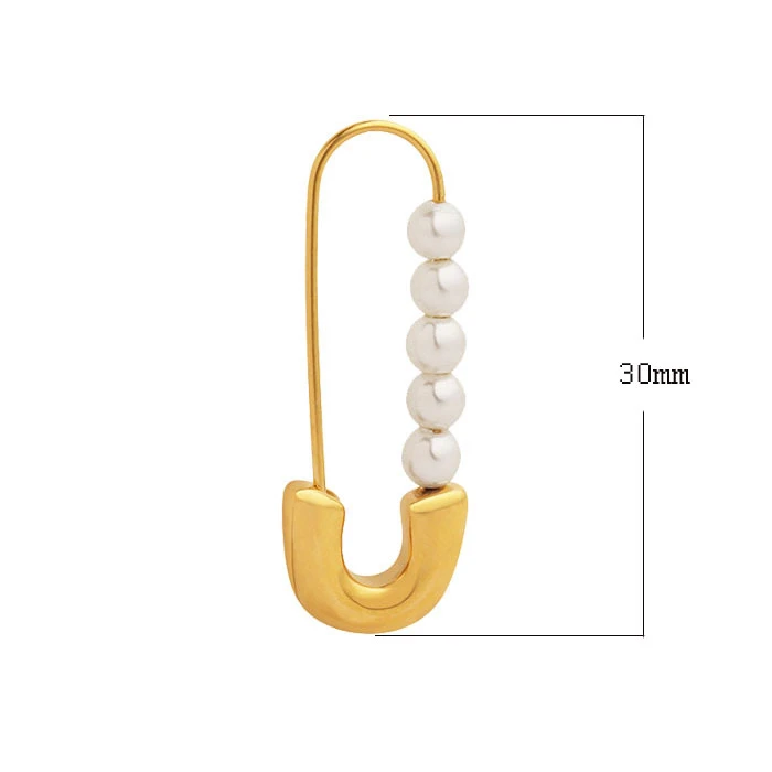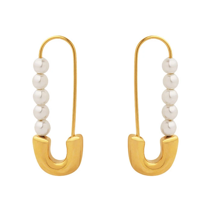 Ocelové visací náušnice napodobující spínací špendlík. Povrch náušnic je pozlacený technologií PVD. Délka náušnic 30mm. Náušnice zdobí umělé perly.