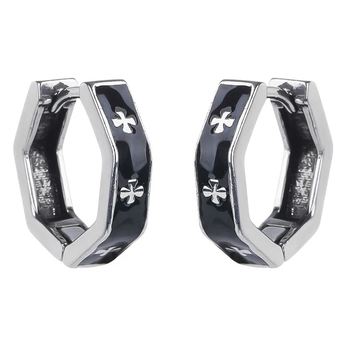 Ocelové náušnice do ucha ve tvaru šestihranu. Pohledová strana je ozdobená kříži zvýrazněnými černou barvou. Zadní strana náušnic je hladká leštěná bez motivu. Rozměr náušnic 14x14mm. Náušnicové zapínání je kloubové.