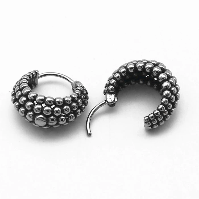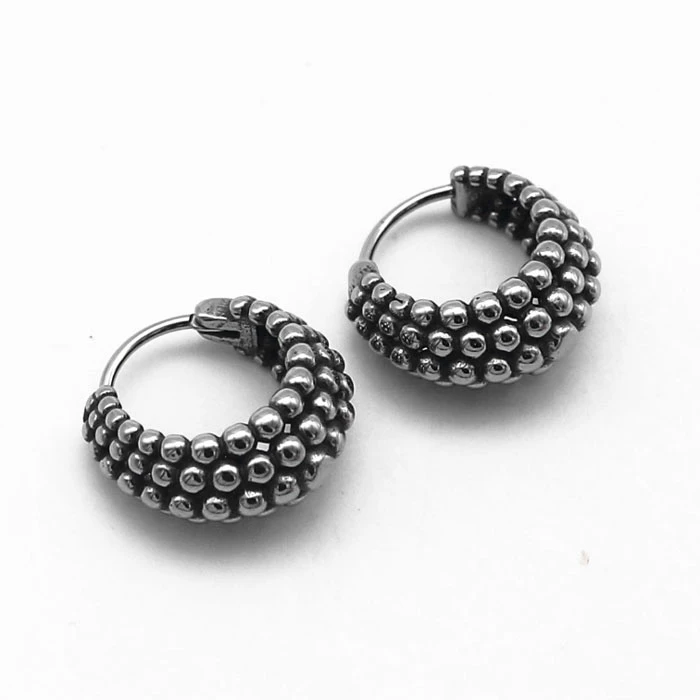 Náušnice kroužky z chirurgické oceli. Náušnice jsou složené z pěti řad "korálků". Šířka náušnic v nejužším místě 5mm, v nejširším bodě 8,5mm. Vnější průměr náušnic 17mm. Uvedená cena platí za pár náušnic.