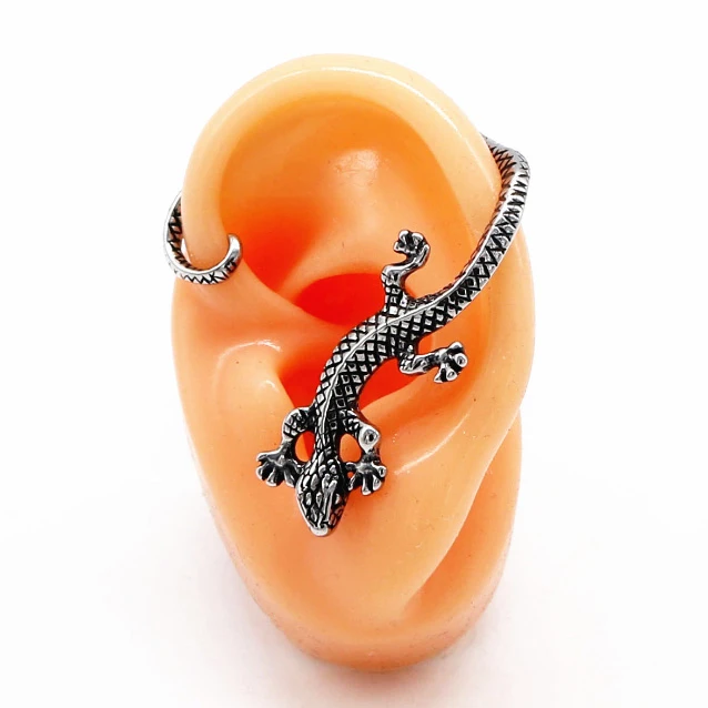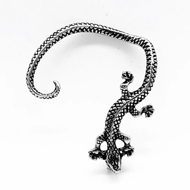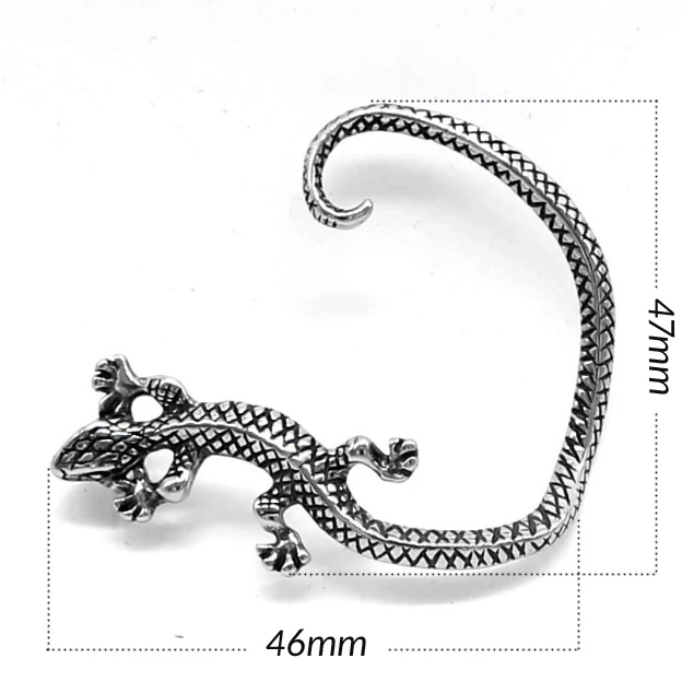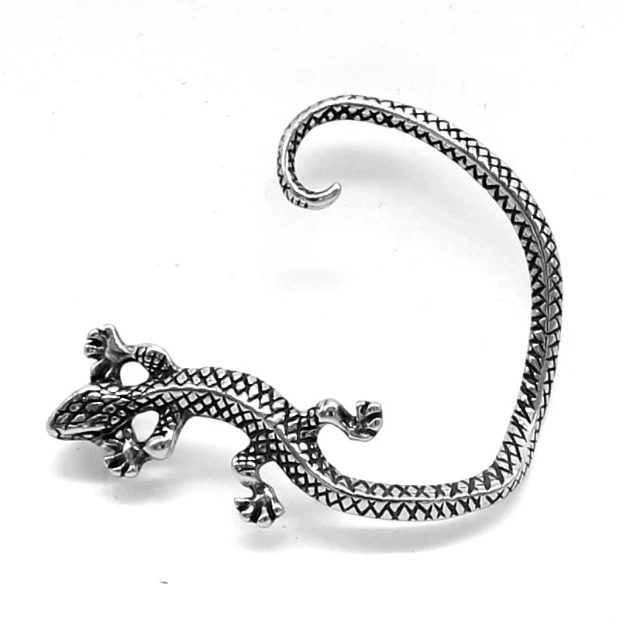 Náušnice přes ucho z chirurgické oceli ještěrka. Rozměry náušnice najdete na podpůrné fotografii. Povrch náušnice je plastický a napodobuje ještěrčí kůži. Náušnice se v uchu zajišťuje pomocí puzetky.