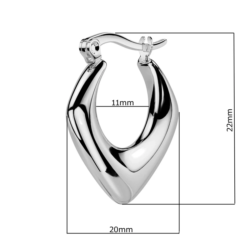 Náušnice z chirurgické oceli pro ženy a dívky. Povrch náušnic je leštěný. Náušnicové zapínání je na francouzský zámek. Vnější rozměry náušnic 22x20mm najdete zobrazené na podpůrné fotografii. Cena je uvedena za pár.