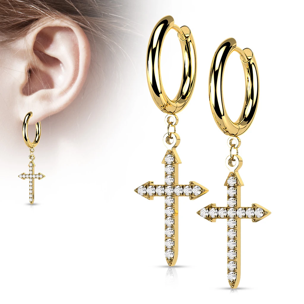 Visací náušnice s křížky. Jako všechny šperky z chirurgické oceli jsou i tyto náušnice kroužky odolné proti poškození, nevyvolávají alergické reakce, neoxidují a nemění barvu. Především pro tyto vlastnosti jsou ocelové náušnice stále vyhledávanými šperky.