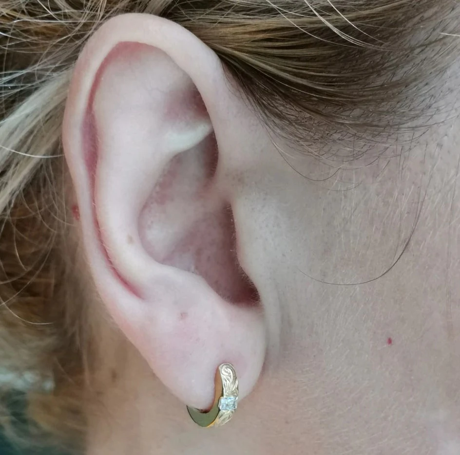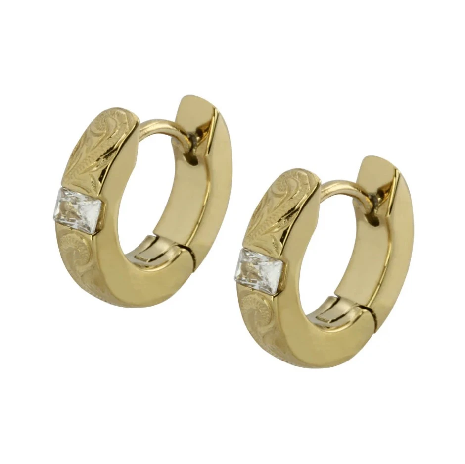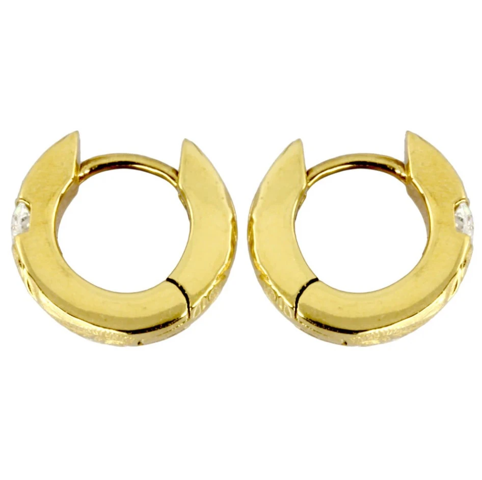 Náušnice kroužky se zirkonem. Náušnice jsou vyrobené z chirurgické oceli a osazené prvotřídními zirkony. Náušnice mají leštěný pozlacený povrch zdobený gravírovaným vzorem. Zapínání náušnice je kloubové. Vnější průměr náušnic 13mm, vnitřní průměr 8mm, šířka náušnic 3mm. Cena je uvedena za pár.