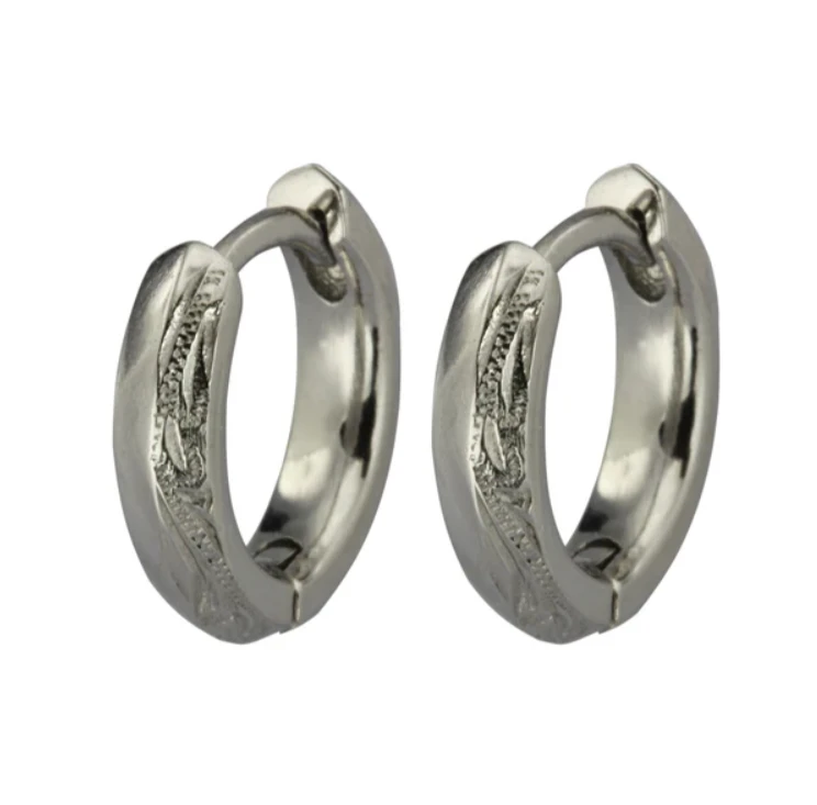Náušnice kroužky z chirurgické oceli. Povrch náušnic je leštěný s gravírovaným vzorem. Zapínání náušnice je kloubové. Vnější průměr náušnic 13mm, vnitřní průměr 9mm, šířka náušnic 3mm. Cena je uvedena za pár.