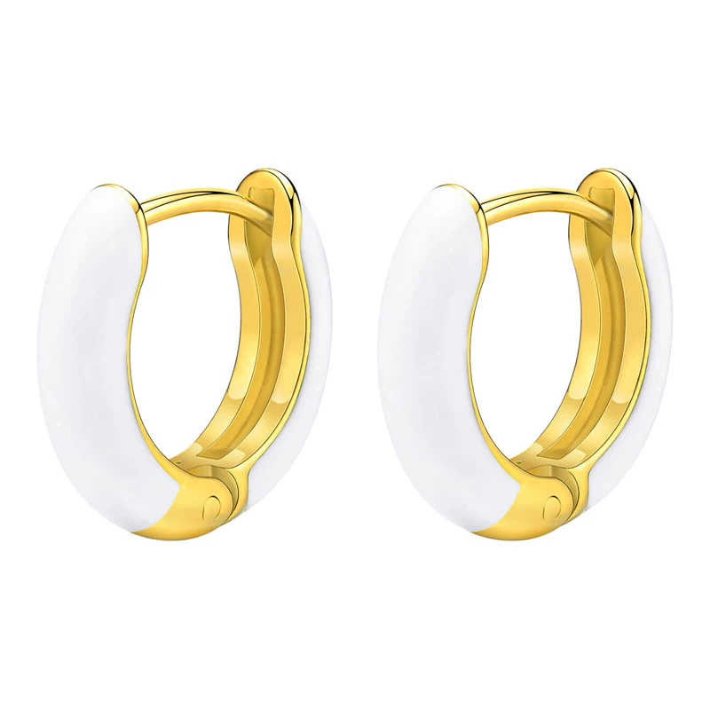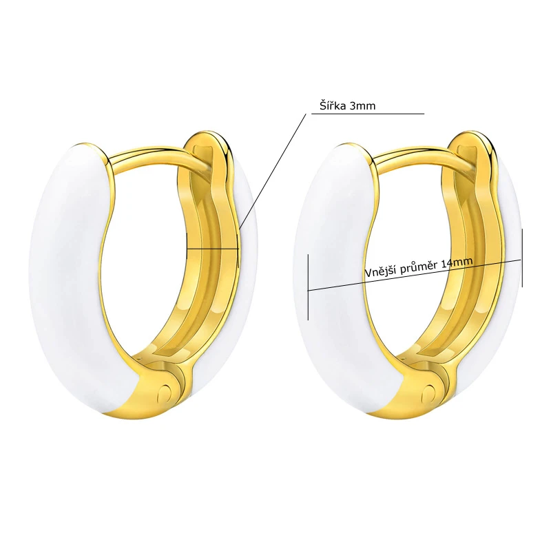 Náušnice kroužky z chirurgické oceli s pozlaceným povrchem. Bílé části náušnice jsou smaltované. Šířka náušnic 3mm, vnější průměr 14mm. Náušnicové zapínání je kloubové.