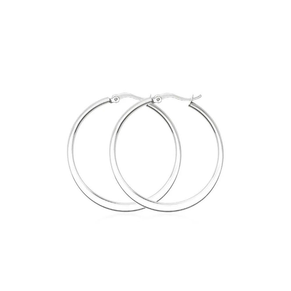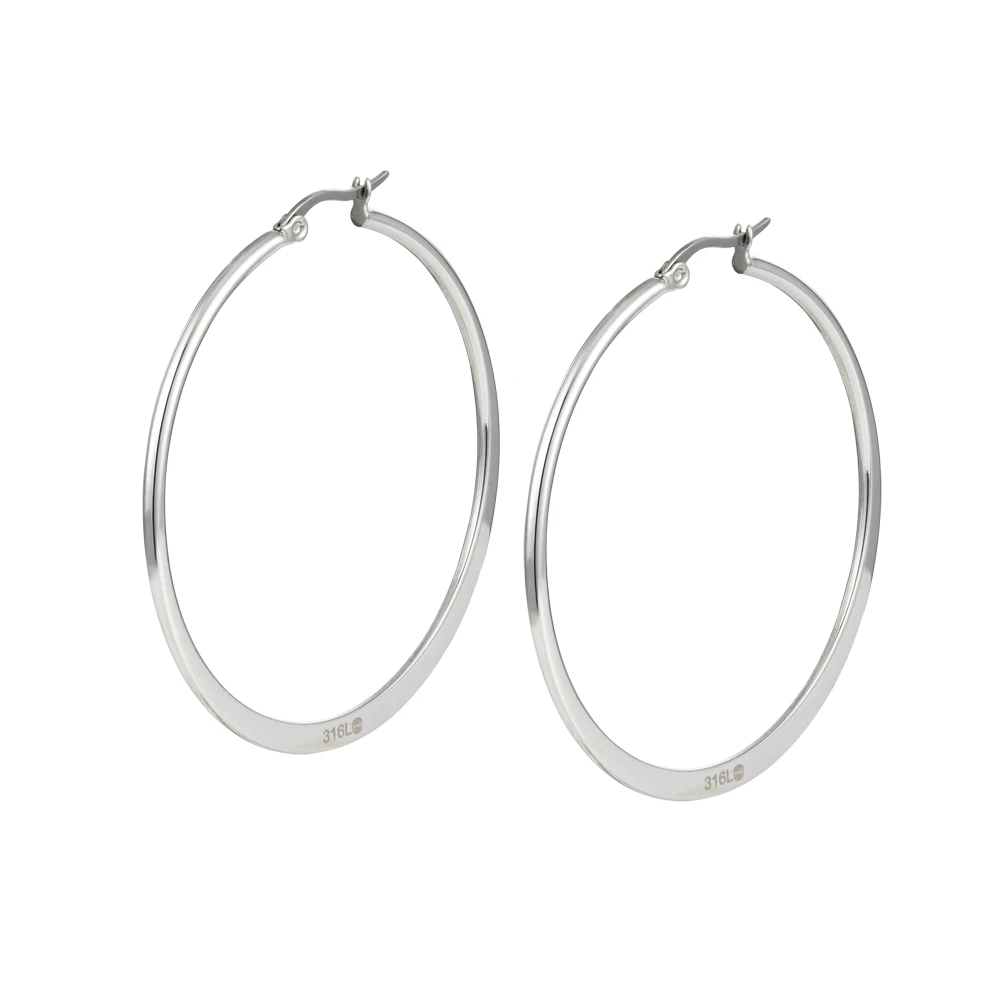 Náušnice kruhy z chirurgické oceli. Povrch náušnic je leštěný. Vnější průměr náušnic 32mm. Náušnicové zapínání je na francouzský zámek.