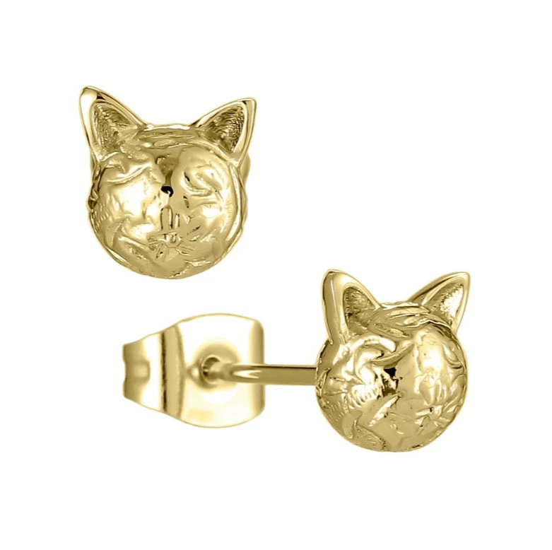 Netradiční ocelové náušnice pecky. Náušnice představují čelní pohled na myší hlavu. Povrch náušnic je se vzorem pozlacený technologií PVD. Průměr náušnic 6mm. Náušnicové zapínání je na puzetky. Uvedená cena platí za pár.