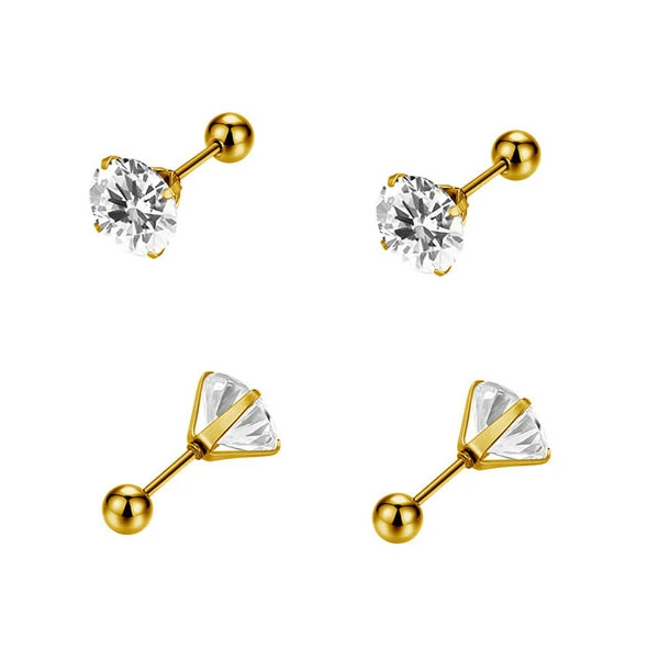 Ocelové náušnice se zapínáním na šroubek, dřík má průměr 1,0mm, šroubovací kulička má průměr 4mm. Povrch náušnice je pozlacený technologií PVD. Díky zapínání se šroubovací kuličkou náušnice netlačí a pohodlně se nosí. Průměr bílého zirkonu 3mm. Uvedená cena platí za pár.