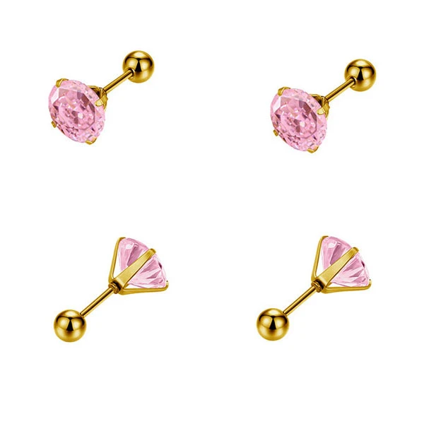 Ocelové náušnice se zapínáním na šroubek, dřík má průměr 1,0mm, šroubovací kulička má průměr 4mm. Povrch náušnice je pozlacený technologií PVD. Díky zapínání se šroubovací kuličkou náušnice netlačí a pohodlně se nosí. Průměr růžového zirkonu 3mm. Uvedená cena platí za pár.