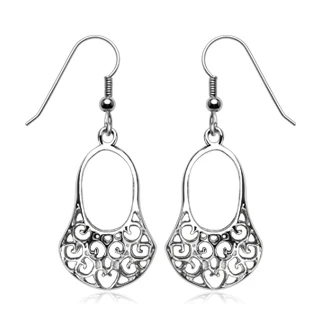 Náušnice z chirurgické oceli 316L. Visací ocelové náušnice. Zajímavé náušnice s ozdobou. Povrch náušnice je leštěný s plastickým vzorem. Rozměr ozdobné části náušnic 27176mm, Celková délka náušnice včetně závěsu 47mm. Uvedená cena za 1 pár.