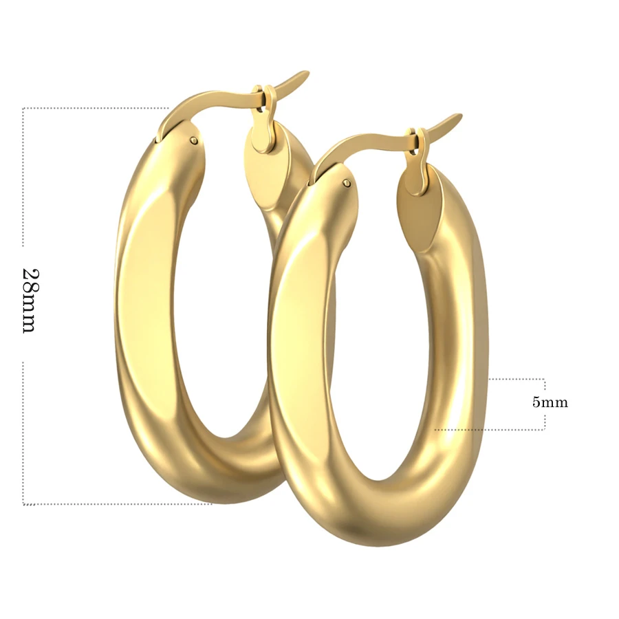 Pozlacené náušnice z chirurgické oceli oválky. Povrch náušnic je matný, pozlacený technologií PVD. Náušnice jsou "vysoké" 28mm, šířka 5mm. Rozměry náušnic najdete zobrazené na podpůrné fotografii.