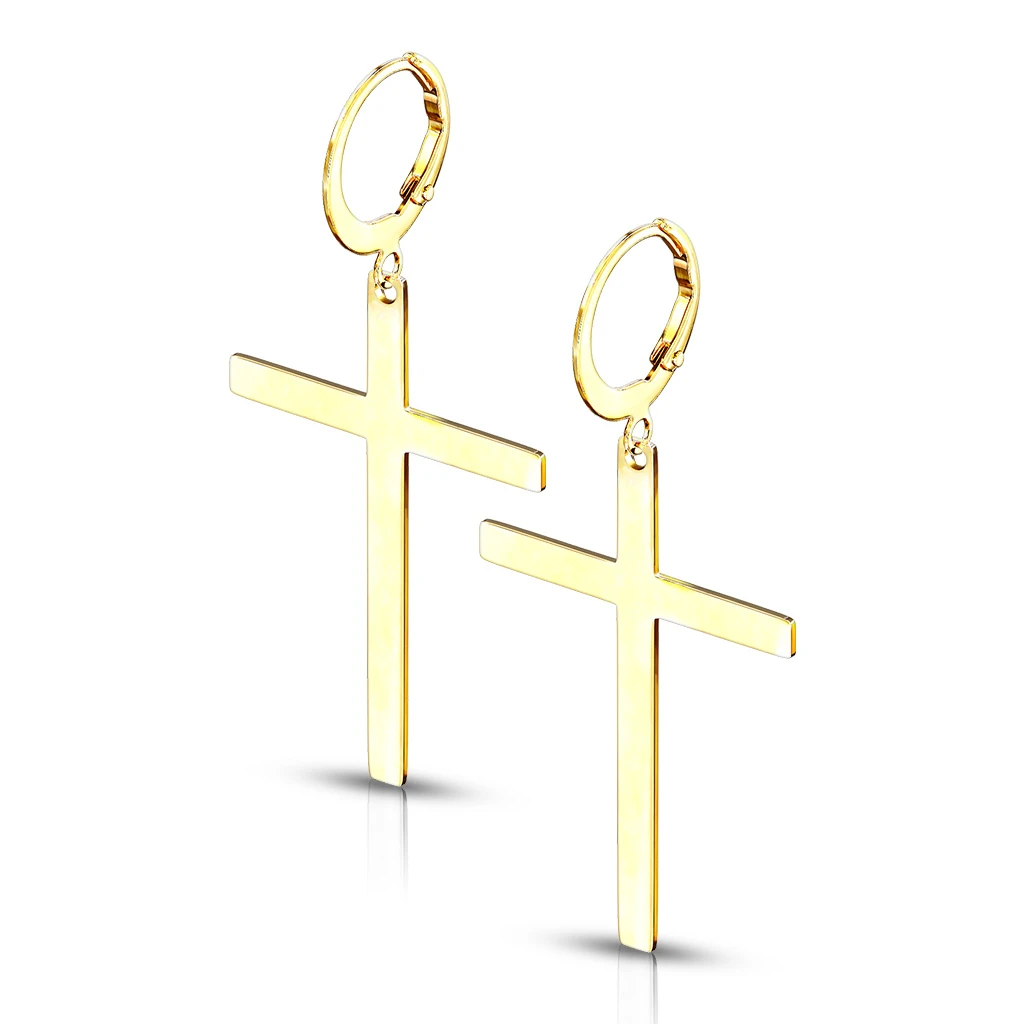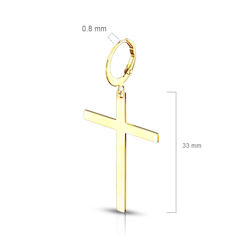 Náušnice kroužky z chirurgické oceli s křížkem. Povrch náušnic je leštěný. Rozměr křížku 33x23mm, vnější průměr kroužku 12mm.