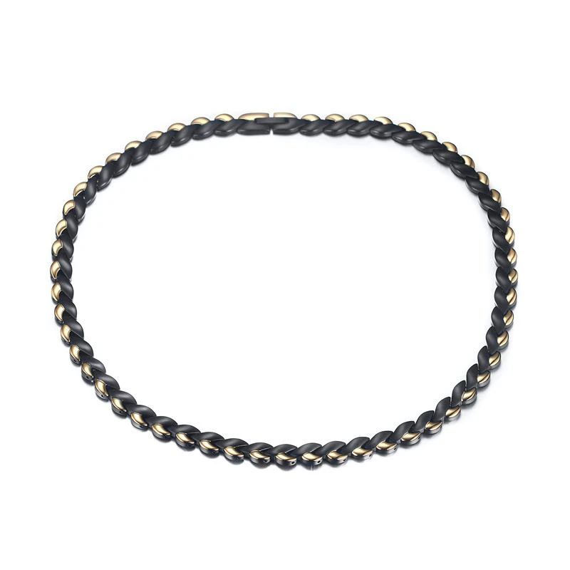Náhrdelník z chirurgické oceli s magnety černý. Povrch náhrdelníku je barevně upravený technologií PVD. Náhrdelník tvoří články ve tvaru lístečků. Náhrdelník je široký 9 mm, délka náhrdelníku 49 cm. Na přání je možné náhrdelník zdarma zkrátit.