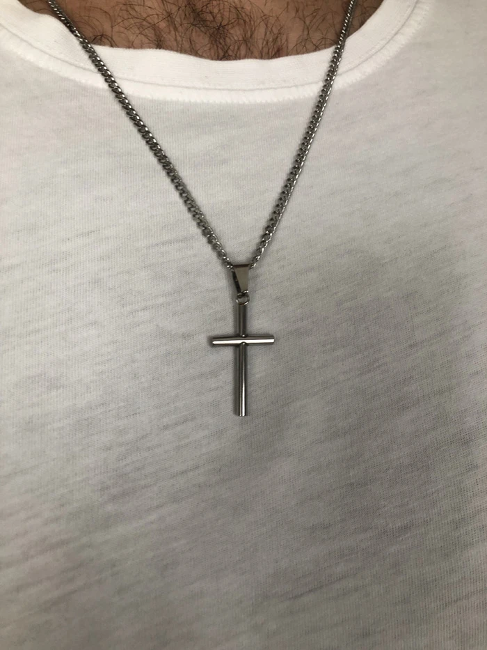 Náhrdelník z chirurgické oceli s křížkem. Povrch křížku a řetízku je leštěný. Rozměr křížku 33x17mm. Řetízek je široký 2,8mm. Délka náhrdelníku 55cm.