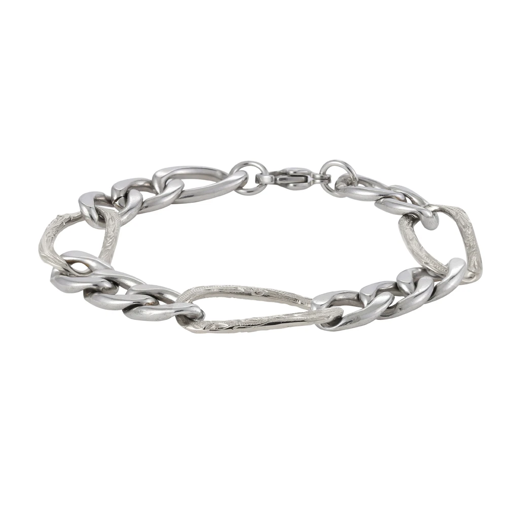 Náramek z chirurgické oceli vzor figaro, který nikdy nevyjde z módy. Povrch náramku je hladký leštěný, oválná očka mají gravírovaný povrch. Zapínání náramku je karabinové. Náramek je dlouhý 21cm, šířka 12mm. Na přání lze délku náramku zdarma zkrátit.